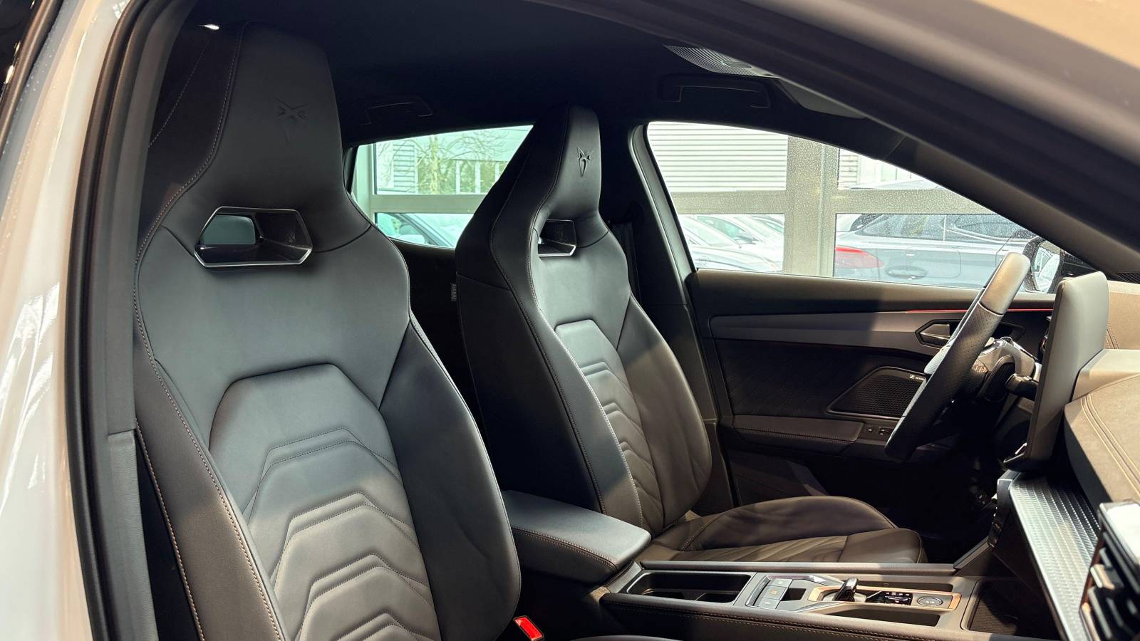 - Design intérieur Progressive - Sièges baquets cuir Gris Lunaire avec surpiqûres cuivrées - Logos CUPRA embossés sur les appuie-têtes - Planche de bord Gris Lunaire surpiquée avec inserts Dark Alu - Contre-portes en TEP noir surpiqués - Sièges conducteur et passager chauffants avec réglage électrique à mémoire, y compris réglage lombaire