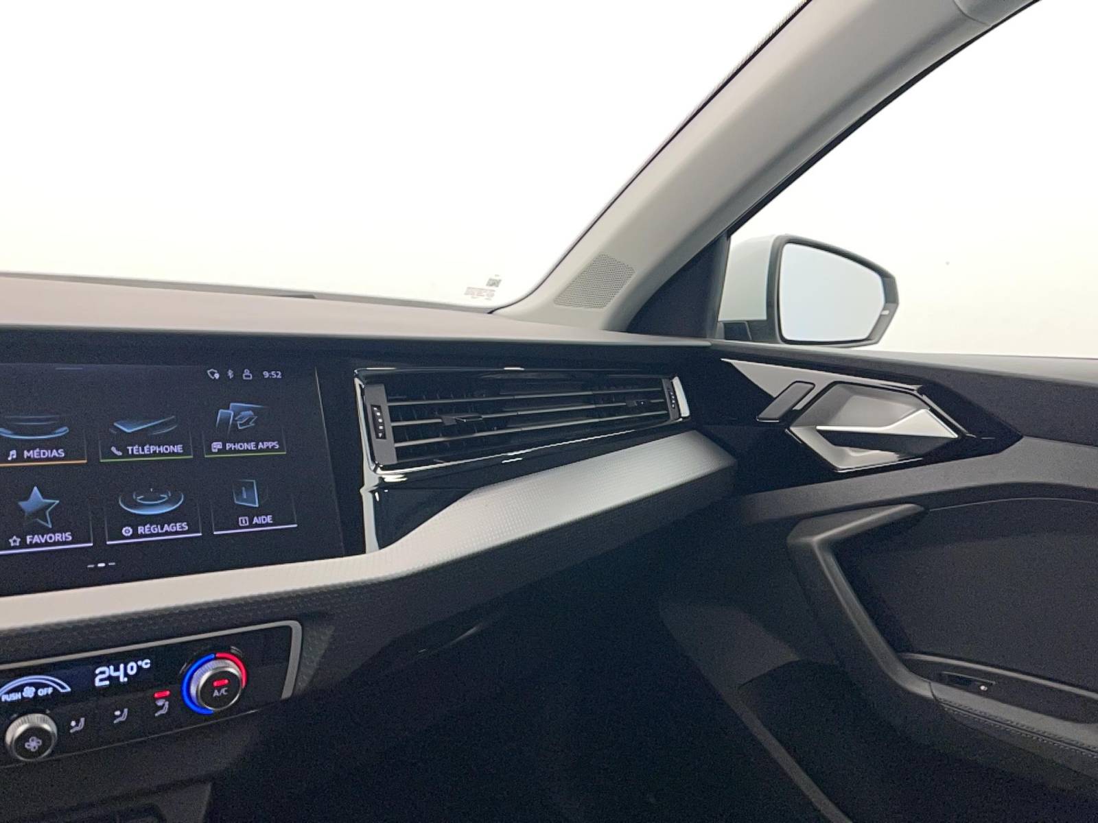 - Applications décoratives étendues sur le tableau de bord façon verre en noir, de l'écran couleur MMI touch jusqu'aux triangles de portières AV façon verre en noir