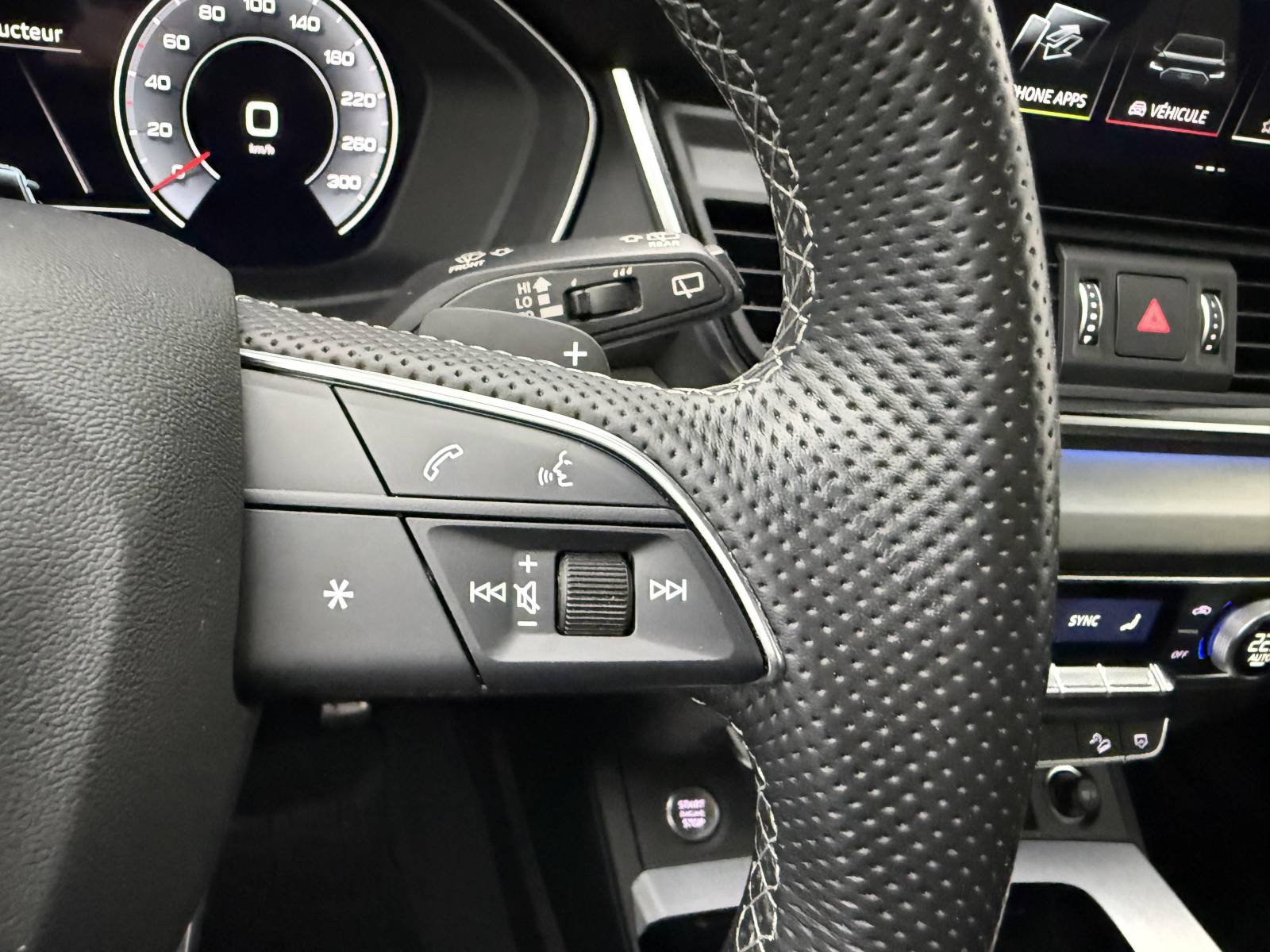 - Volant Sport contour en Cuir style 3 branches aplati en bas avec multifonction plus avec palettes de changement de vitesses