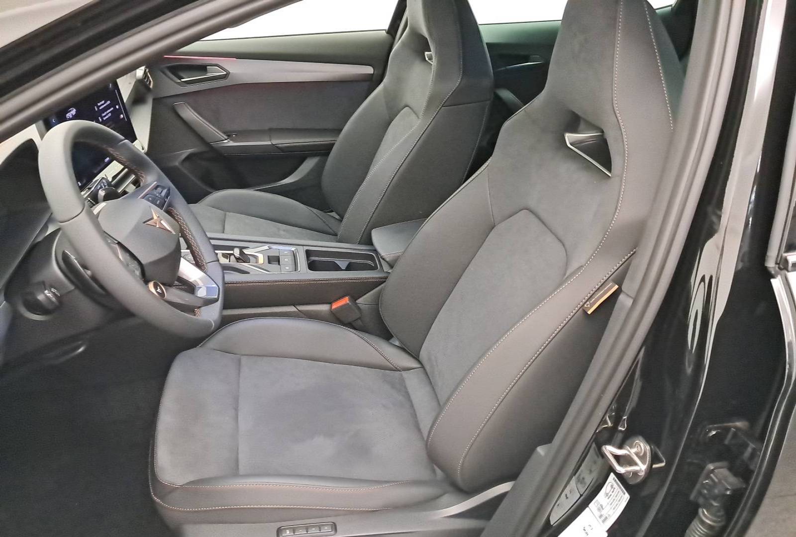 - Design intérieur Dynamic - Sièges baquets suédine Noir Asphalte avec poinçonnage Bleu Astral et surpiqûres cuivrées - Logos CUPRA estampés sur les appuie-têtes - Planche de bord noire surpiquée avec inserts Dark Alu - Contre-portes suédine noire avec poinçonnage Bleu Astral - Siège conducteur : chauffant avec réglage électrique à mémoire, y compris réglage lombaire - Siège passager : chauffant avec réglage manuel de la hauteur