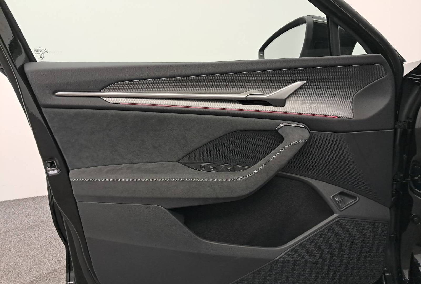 - Insert décoratif chrome foncé sur planche de bord/contreportes inserts en continuité de la poignée de porte Unique Dark Chrome (rendu alu mat), Habillage tissu suédine noir sur planche de bord/contreportes/poignée de maintien de porte