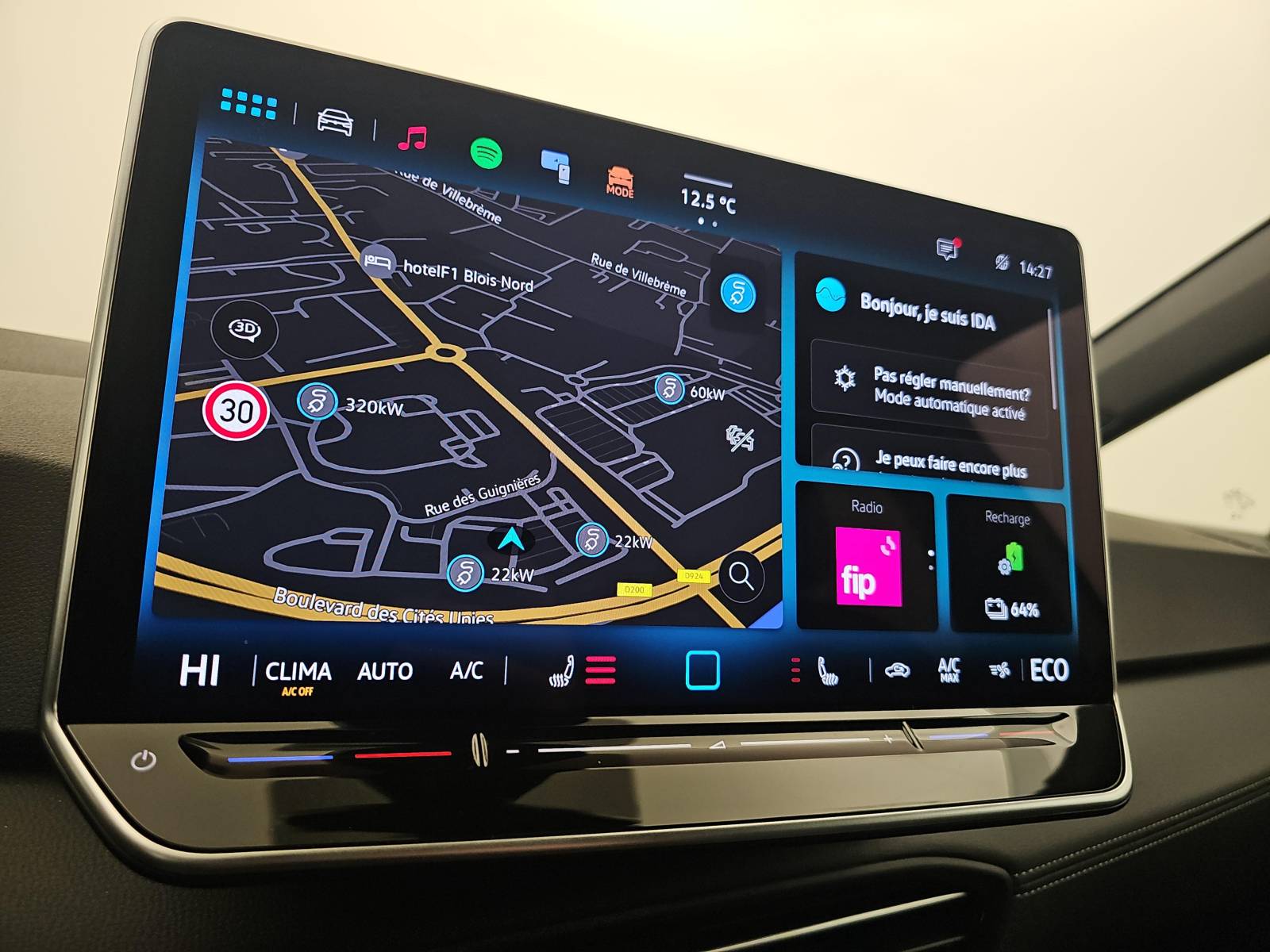 - Climatisation stationnaire: permet de réfrigérer, de ventiler ou de chauffer l'habitacle du véhicule à l'arrêt. Elle permet également de dégivrer le pare-brise, de le désembuer et de le débarrasser d'une fine couche de neige en hiver. La climatisation stationnaire est alimentée par la prise de courant ou par la batterie haute tension du véhicule
