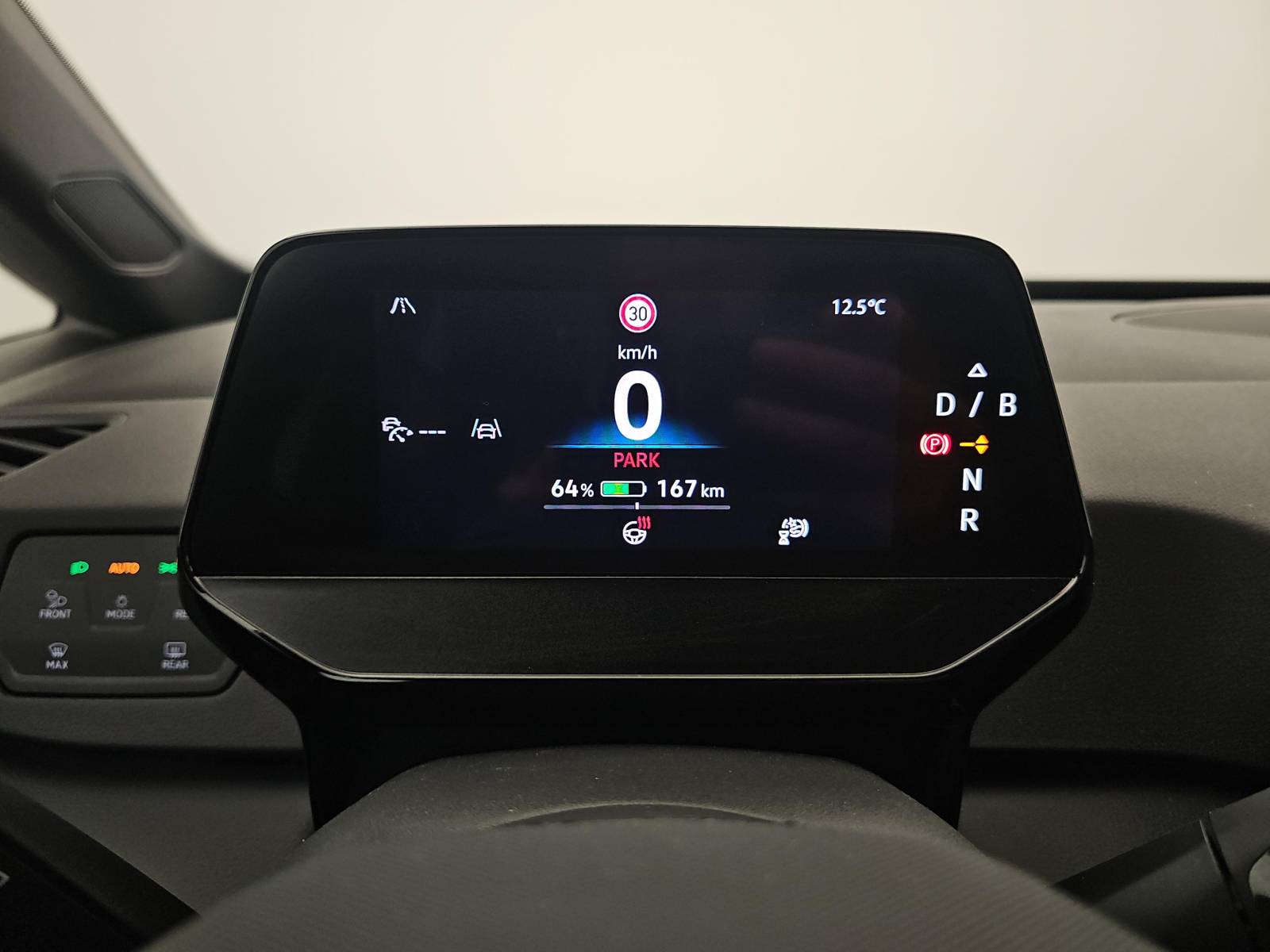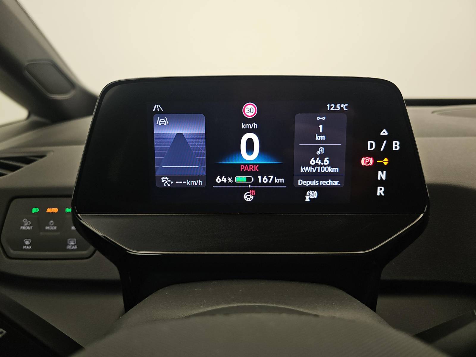 - Sélecteur de vitesse situé à droite derrière le volant avec frein de stationnement électronique Il dispose d'une marche AV (D/B), du neutre (N) et d'une marche AR (R). En position (D), la récupération d'énergie au freinage est en mode normal. En position (B), le système d'aide à l'éco-conduite est activé et la récupération d'énergie est plus élevée