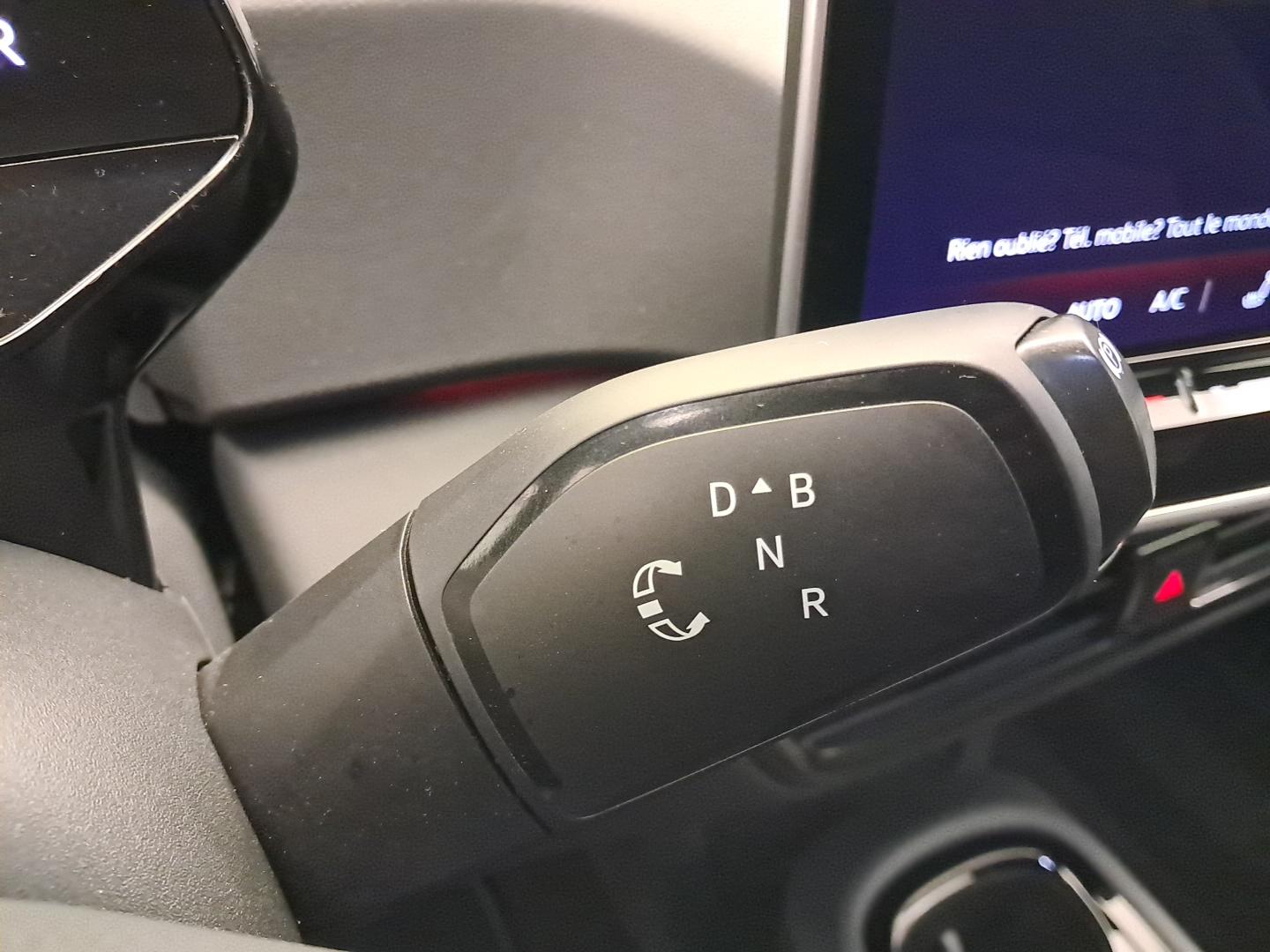 - Sélecteur de vitesse situé à droite derrière le volant avec frein de stationnement électronique Il dispose d'une marche AV (D/B), du neutre (N) et d'une marche AR (R). En position (D), la récupération d'énergie au freinage est en mode normal. En position (B), le système d'aide à l'éco-conduite est activé et la récupération d'énergie est plus élevée
